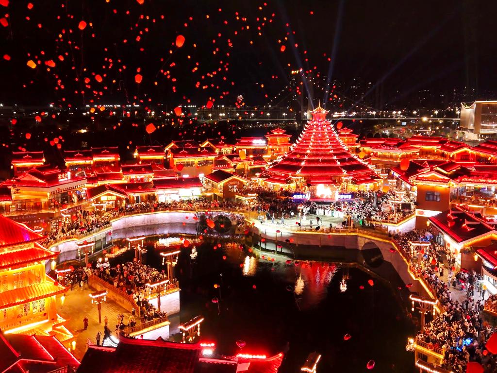 2026年1月1日,在湖南省怀化市鹤城区榆树湾·青春广场,市民们通过逛集市、赏非遗、放飞孔明灯等形式,迎接新年到来。(张卓 摄)