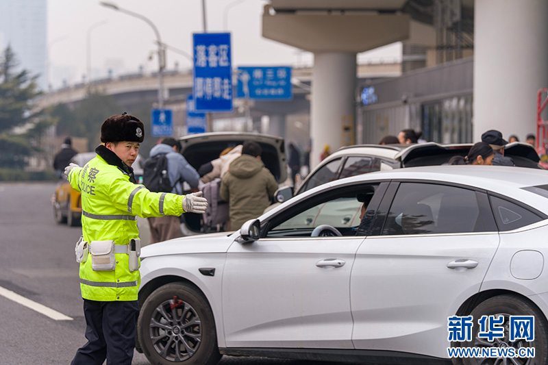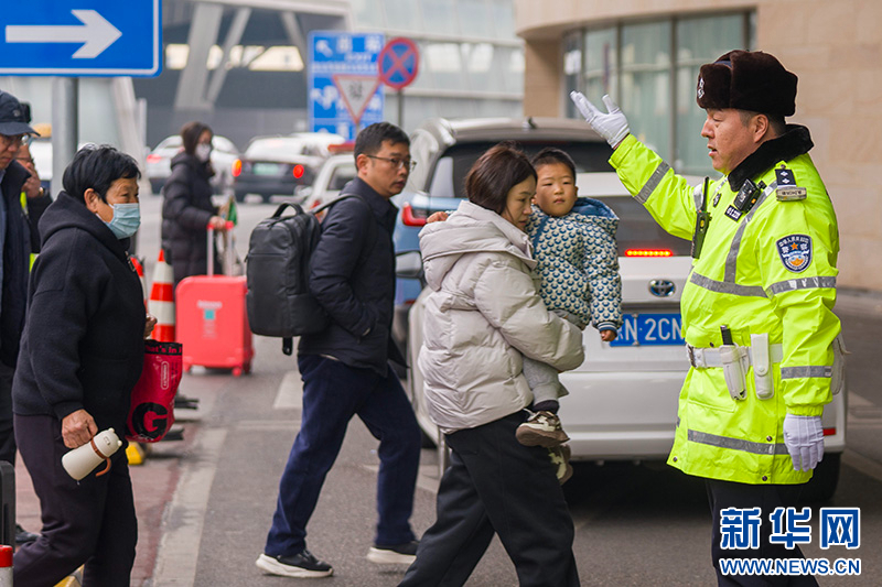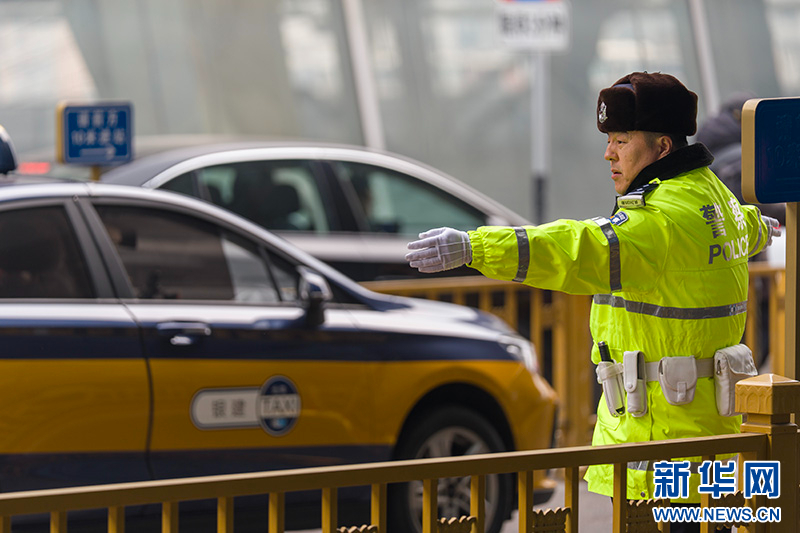 1月30日,北京铁路公安处交通管理支队民警正在北京南站二层落客平台疏导交通。新华网记者 钟奕摄