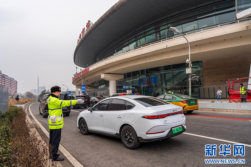 1月30日,北京南站南广场落客区正式启用,全面向社会车辆开放落客功能。北京铁路公安处交通管理支队民警正在疏导交通。新华网记者 钟奕摄