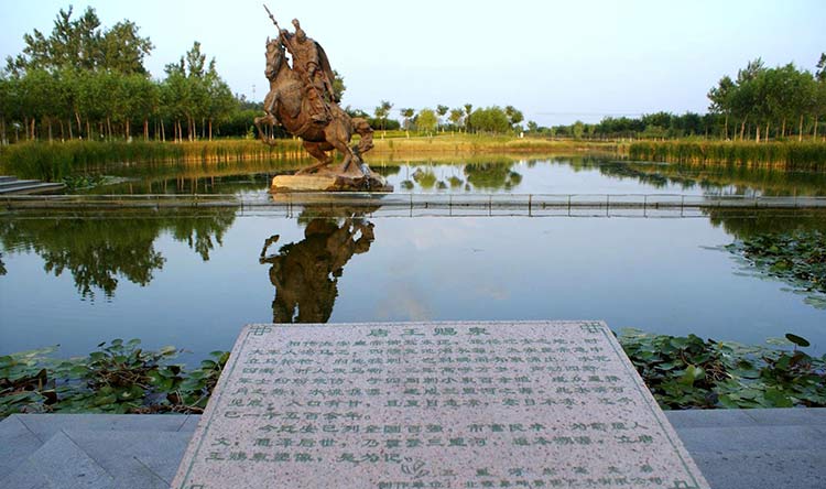 广场主题为唐王雕塑,相传李世民东征行军到迁安,挥枪扎出三口泉眼,一解大队人马饮水之急,因此唐王御封三里河为"铜帮铁底饮马河"。