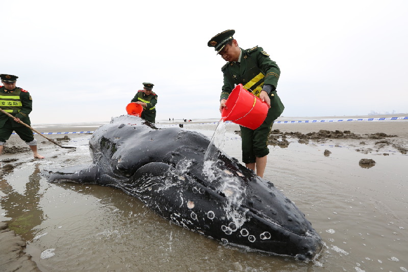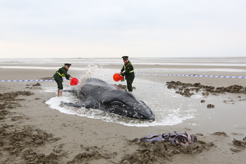 13日12时许,一头座头鲸搁浅江苏省启东市海滩,江苏边防总队连兴港边防派出所接到渔民报警后,迅速组织官兵出警。