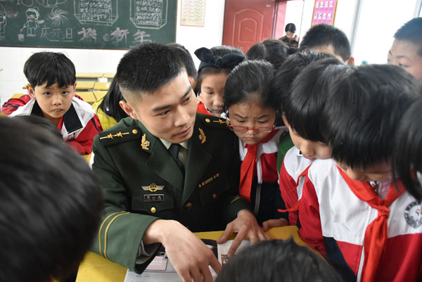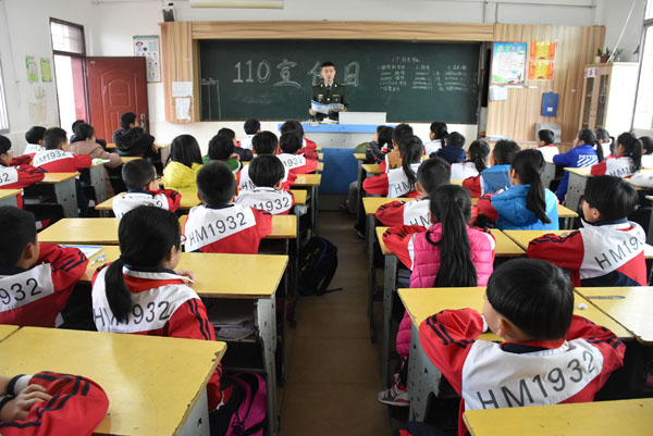 边防官兵正在向学生讲授“110”相关知识