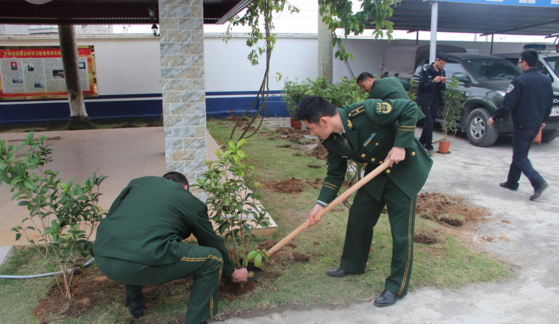 近日,广西北海沙田边防派出所官兵在营区开展植树活动,美化了环境,使警营又增添了新绿。