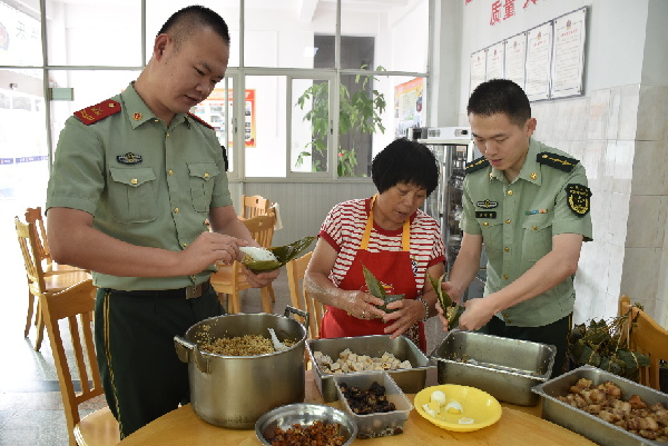 官兵与食堂阿姨在厨房内一起兴致勃勃地包粽子,很多官兵都是第一次包粽子,笨手拙脚的样子不时引来阵阵的笑声,在食堂阿姨的耐心帮助下,官兵们很快也学会了,一个个成型的粽子呈现在眼前。大家互相指导、互相配合,场面温馨热闹,充满欢声笑语,辛勤的劳动使得整个警营都充满着温馨浓郁的节日气氛。(刘瑜泉)