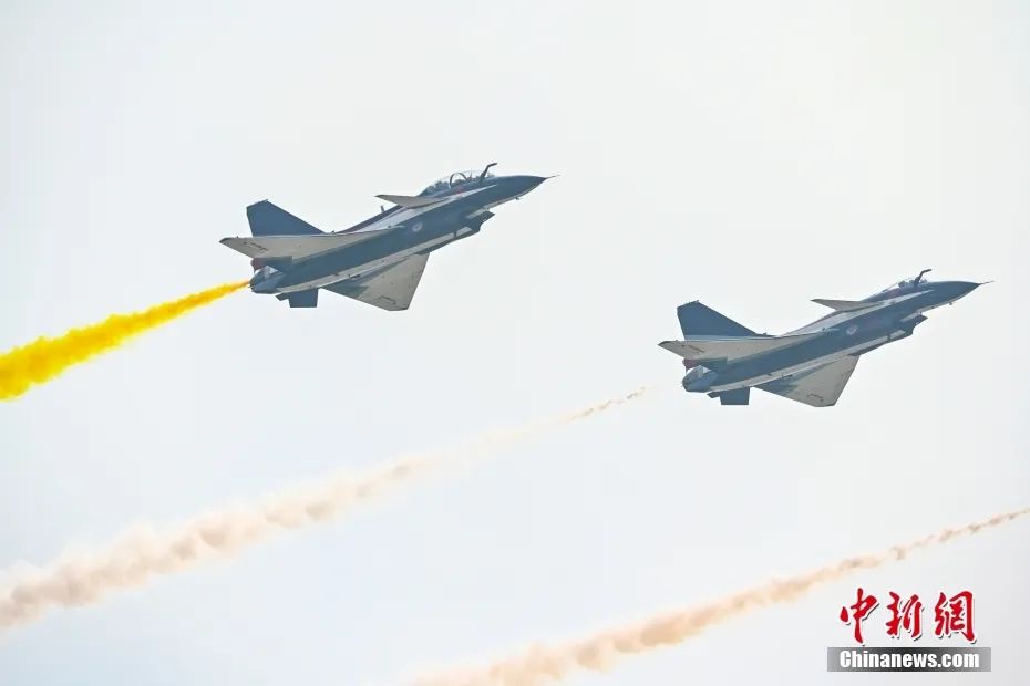 9月28日,广东省珠海市,教—10飞机在珠海国际航展中心上空飞过。当日,第十三届中国航展在珠海国际航展中心开幕。中新社记者 陈骥旻 摄