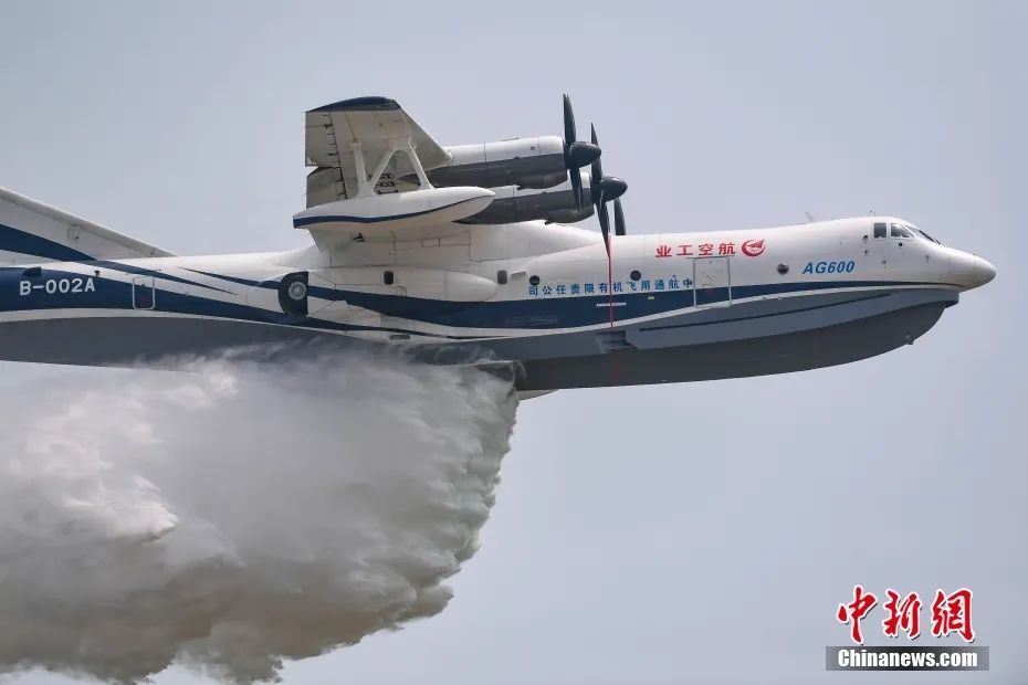 9月28日,广东省珠海市,大型灭火/水上救援水陆两栖飞机“鲲龙”AG600进行飞行投水功能演示。中新社记者 陈骥旻 摄