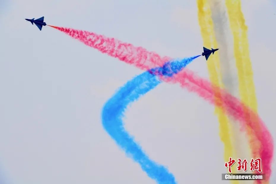 开幕式刚结束,空军“八一”特技飞行表演队率先登场,飞行员们驾驶歼-10战机,时而箭队、时而楔队、时而筋斗,上演“倒挂金钟”、“向上开花”,引得现场观众叫好连连。