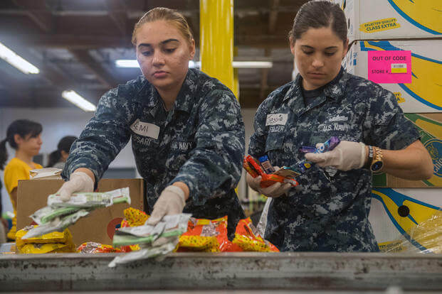 2018年美军水兵在洛杉矶地区“食物银行”社区活动中对捐赠的食物进行分类。美国海军图