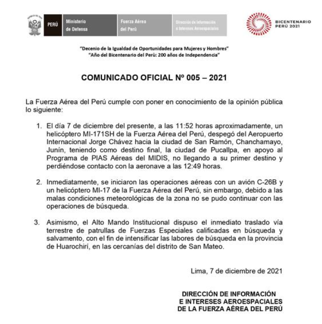 但秘鲁空军公报称,该直升机并没有准时到达第一个目的地(圣拉蒙市),而是在12时49分从雷达上消失,消失地点为安第斯山脉附近。