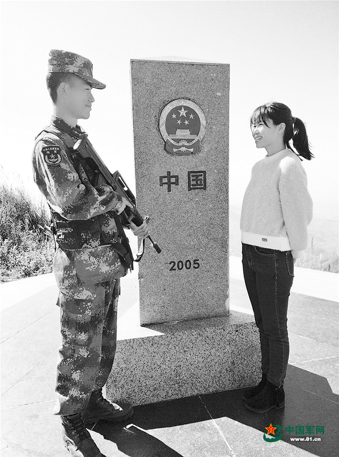 界碑前,他俩合影留念,界碑上红色的“中国”二字,见证了这对军营恋人的幸福时刻。(董浩浩、李庆)