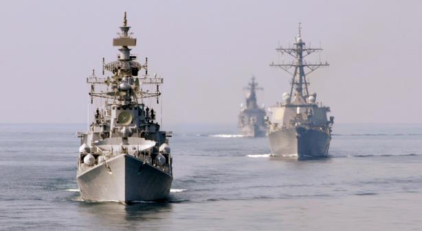 “兰维尔”号驱逐舰(左一)参加“马拉巴尔”演习画面