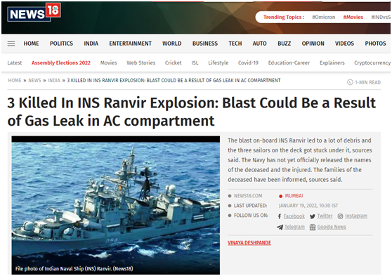 据印度News18网站19日报道,消息人士透露,“兰维尔”号是印度海军最古老的战舰之一,爆炸显然与弹药无关,很可能是由于无人空调室的氟利昂泄漏造成的。爆炸发生时,这个舱室内没有人。三名死亡的舰员位于该舱室上方的混乱甲板上。爆炸产生大量的碎片,这三人被困无法移动。