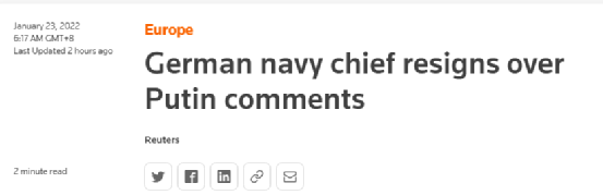 综合路透社、“今日俄罗斯”(RT)等多家外媒报道,德国海军司令舍恩巴赫22日宣布辞职,此前他因称“普京值得尊重”、“乌克兰永远不会从俄罗斯手中拿回克里米亚”而在国内受到批评。