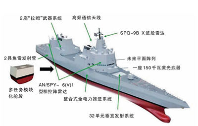 DDG(X)基线版本的武器系统并无新意,包括Mk41导弹垂直发射系统、Mk45型127毫米主炮和21联装“拉姆”武器系统。垂直发射系统共有96个发射单元,采用前部32单元、中部64单元方式布置。未来版本武器系统将有较大变化。其中,前部32单元垂直发射系统将被12单元高超音速武器系统发射装置替代,另外增加一部150千瓦激光武器,艉部的2座“拉姆”武器系统也将被2套600千瓦的激光武器取代,从而实现全激光武器反导设想。