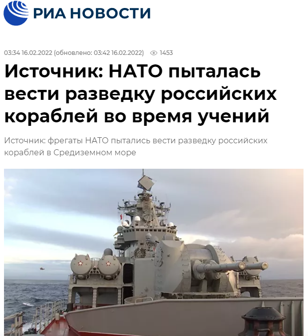 综合俄新社、俄罗斯卫星通讯社报道,一名军方消息人士透露,当地时间15日,北约护卫舰试图对正在地中海军演的俄罗斯船只进行电子侦察。