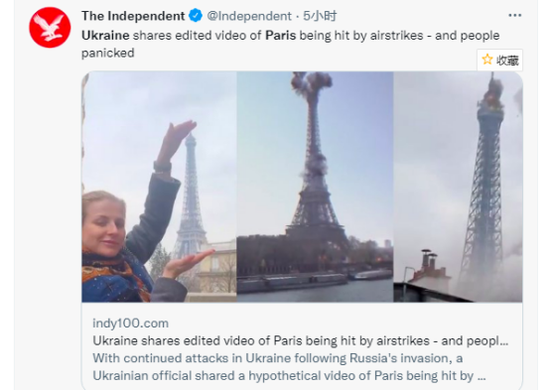 12日,乌克兰国防部更是直接在社交媒体发布了一段经过编辑的视频,描绘了巴黎埃菲尔铁塔遭空袭的场景,并配以字幕:“试想一下,如果这件事发生在其他欧洲国家的首都……要么在乌克兰设立禁飞区,要么给我们提供空中战机。”