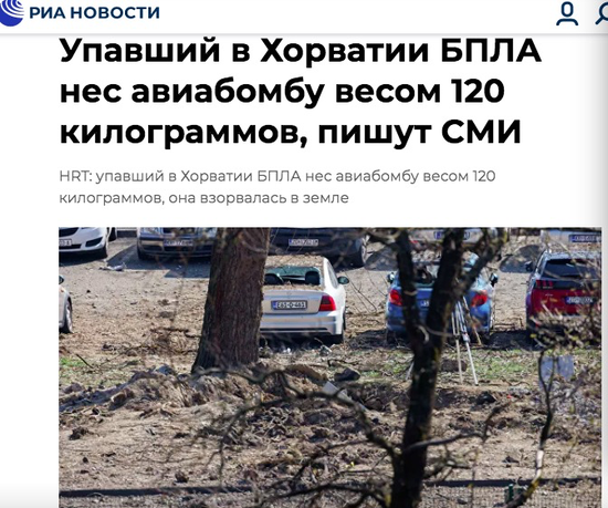 克罗地亚国家广播电视台援引国防部消息人士的话称,在无人机残骸中发现的炸弹重达120公斤。当时无人机撞击到松软地面,爆炸发生在地下。如果坠机落在混凝土或沥青上,后果将是灾难性的。