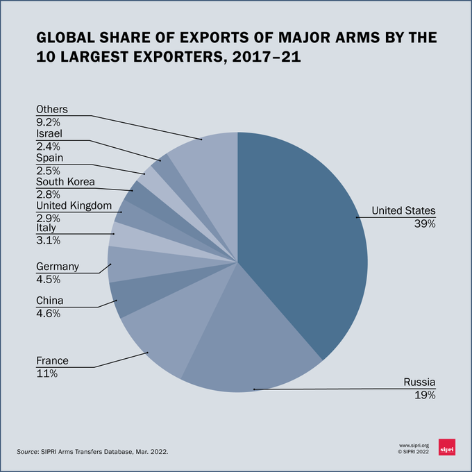 △2017年-2021年全球大出口武器出口国占全球份额 图片来源:SIPRI