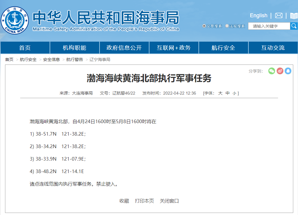 据中国海事局网站消息,渤海海峡黄海北部,自4月24日16时至5月8日16时将在