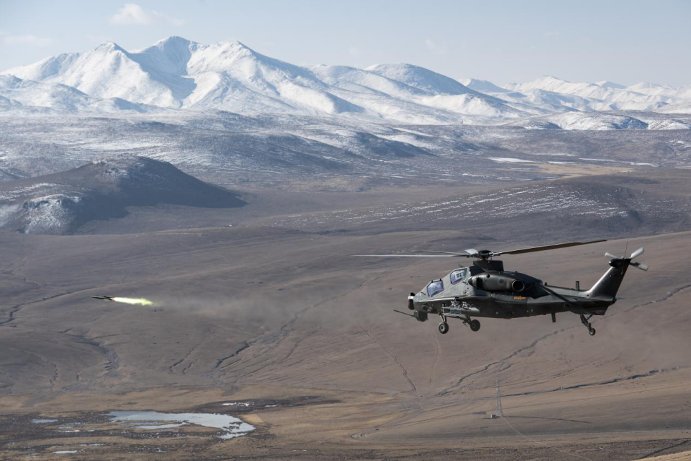 近日,西藏军区某旅在海拔4500米的高原某演训场开展攻击直升机实弹射击训练。