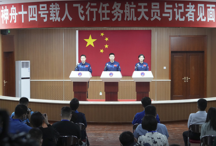 6月4日,执行神舟十四号载人飞行任务的3名乘组航天员陈冬(中)、刘洋(右)、蔡旭哲在酒泉卫星发射中心问天阁与媒体记者集体见面,并回答记者提问。新华社记者 李刚 摄