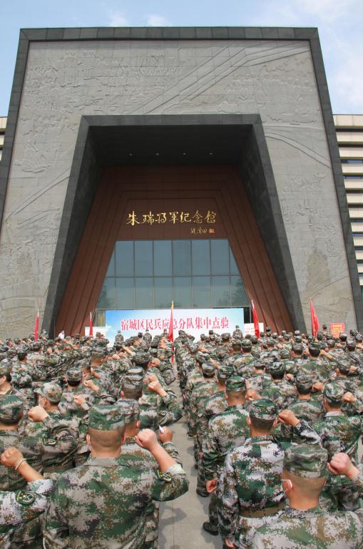 6月9日,在江苏省宿迁市朱瑞将军纪念馆前广场,宿迁市宿城区对全区10余支民兵应急分队进行集中拉动点验,600余名民兵应急队员参加了拉动。嘹亮的军歌、庄重的誓言在朱瑞将军纪念馆上空回响。