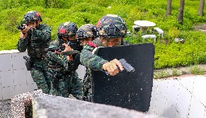 6月15日,武警广西总队贵港支队紧贴实战要求,组织特战队员开展实战化反恐演练,检验协同作战能力,锤炼过硬的体能素质和军事技能水平,为遂行多样化任务奠定坚实基础。(孙跃 摄影报道)