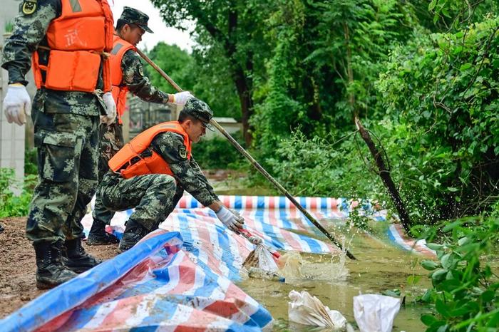 受连续强降雨影响,江西省乐平市乐港镇黎家山沿江低洼地区出现漫堤、涵管破裂等险情。6月21日,武警江西总队机动支队100余名官兵携带抢险器材赶赴现场,用沙袋和防护网对堤坝进行加固,险情得到控制。(彭丁)