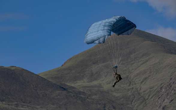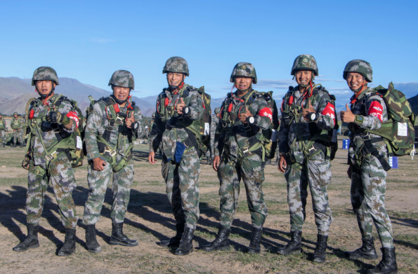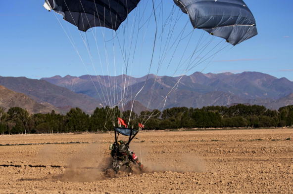 近日,西藏军区某特战旅在海拔3700米的青藏高原某着陆场完成翼伞适应性训练。训练中,跳伞员采取延时开伞方式,跃出舱门飞向蓝天,朵朵伞花迎风绽放。