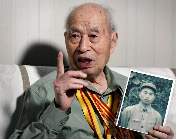 6月7日,在河南省平顶山市,抗战老战士邵开源展示年轻时的照片。新华社记者 李安 摄