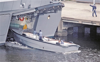 上面这张照片中,一艘小型快艇正缓缓驶入舰艉坞舱。此时坞舱门大开,内部侧壁陈设一览无余。