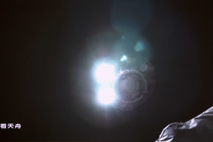 7月17日在北京航天飞行控制中心拍摄的天舟三号货运飞船撤离空间站组合体图像。这是天舟三号货运飞船正在向200米停泊点撤离。新华社记者 郭中正 摄