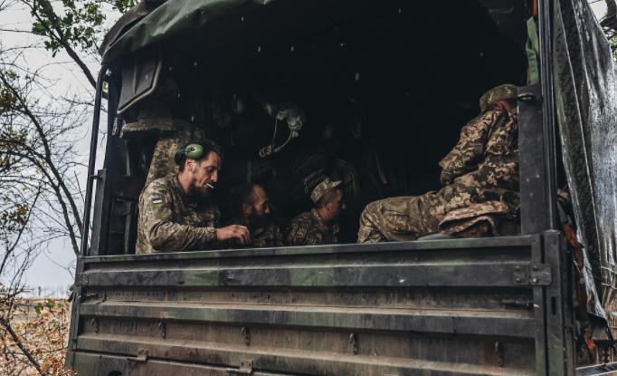 顿涅茨克地区,前线的乌克兰士兵在一辆卡车上