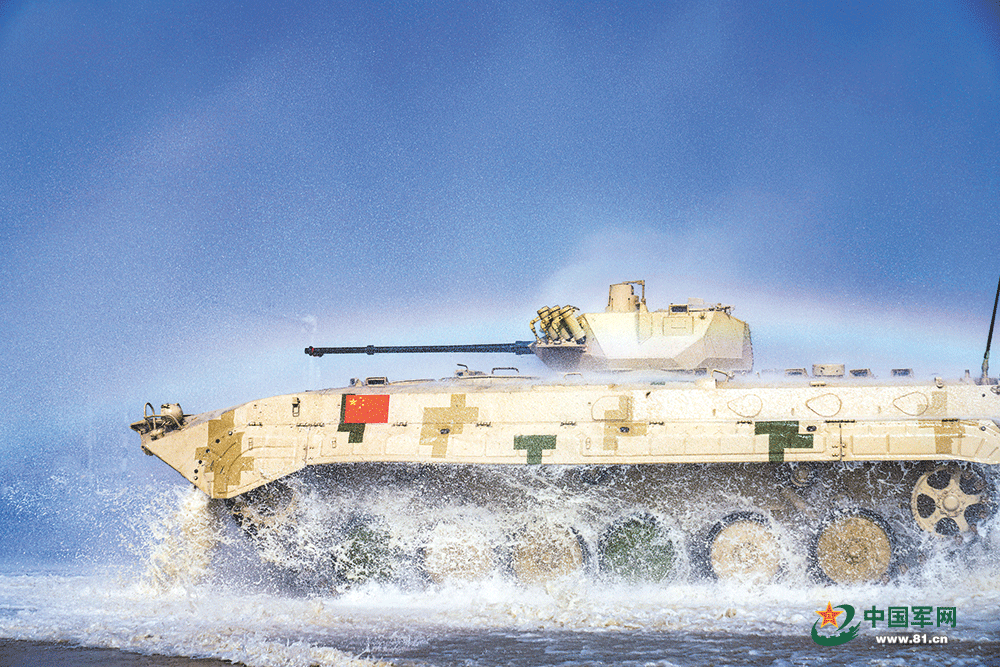中国参赛车组驾驶步战车穿过涉水场。李硕勋摄