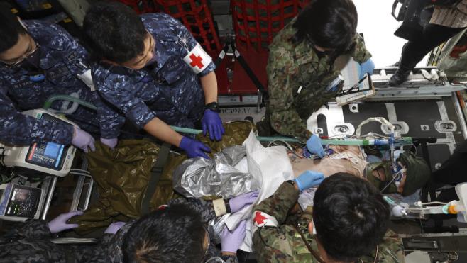 当地时间2022年11月15日,日本冲绳县,在日本航空自卫队那霸基地,美日C-130大力神运输机救援训练向媒体开放。(视觉中国)