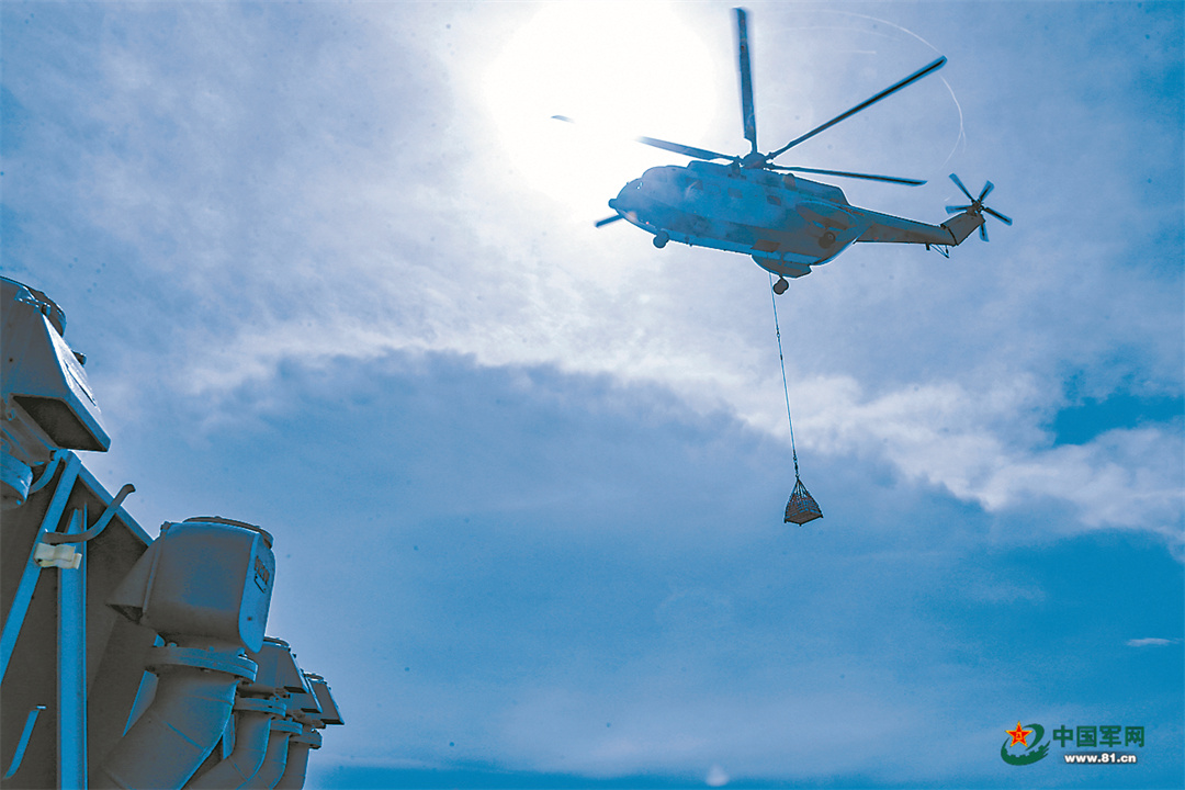 海上战斗刚结束,查干湖舰接到新的命令,紧急前出为某驱逐舰实施补给。到达预定海域后,受补舰靠近查干湖舰占领补给阵位。查干湖舰发射引缆,承载索桥在两舰间凌空架起。对接、扫线、补给,一系列作业紧张有序展开。随后,直升机升空,查干湖舰又采用垂直补给方式,为其他战舰实施补给。