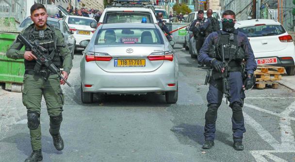 28日,在东耶路撒冷连续发生两起枪击事件后,以色列军警在当地街头进行巡逻。(视觉中国)