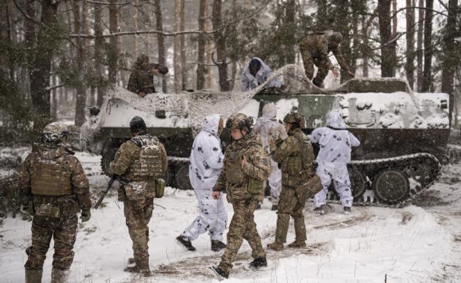 2月18日,乌克兰库皮扬斯克,即将轮换回前线位置的乌克兰军人站在装甲运输车旁。(视觉中国)