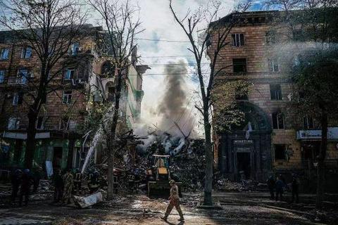 当地时间2022年10月6日,扎波罗热地区遇袭后,消防人员灭火。视觉中国