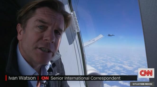 CNN记者在美军机上进行“嵌入式”报道。(CNN视频截图)