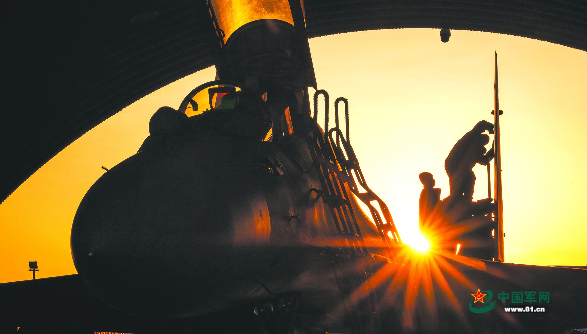 夕阳下,机务官兵正在对战机进行维护。