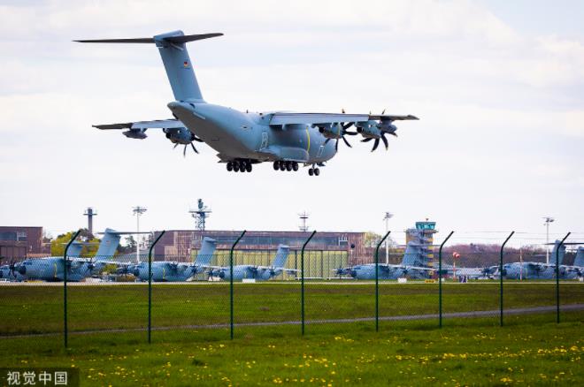 4月19日,德国下萨克森州,德国空军的一架空客A400M运输机降落在汉诺威地区的文斯托夫空军基地,不久前刚从苏丹返回。(视觉中国)