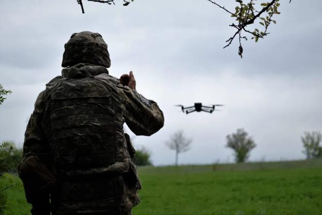 5月8日,一名乌克兰士兵在巴赫穆特操控无人机。(法新社)
