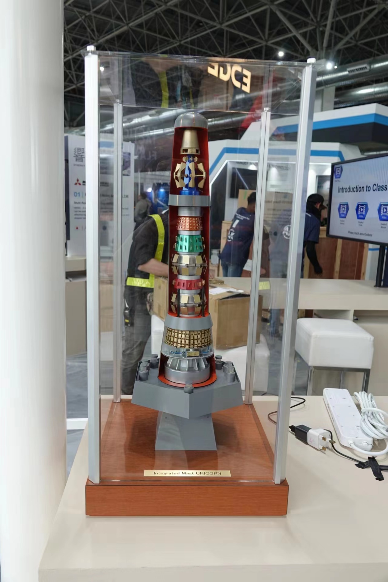 与之前的各型护卫舰相比,“最上”级隐身导弹护卫舰的标准排水量增大到3900吨,满载排水量更是达到5500吨,是“阿武隈”级护卫舰的两倍之多。“最上”级护卫舰最为出色的就是其高性能的隐身设计,上层建筑和舰体大量采用平面、直线结构,尽可能减少一切外部的凸出物。而且,该舰的桅杆也采用了高度一体化的隐身设计,所有雷达以及电子设备的天线都集成在其内部。在展台上,日本防卫省采购技术与后勤局也非常“大方”地展示了隐身集成化桅杆的剖视结构,其设计可圈可点。