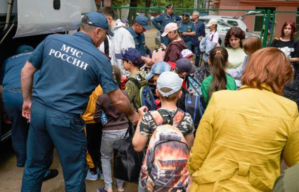当地时间2023年5月31日,俄罗斯沃罗涅日,俄罗斯紧急情况部工作人员协助来自别尔哥罗德地区的儿童抵达Landysh卫生营地临时住宿。由于最近乌克兰的炮击,别尔哥罗德当局将从舍别基诺和Graivoron地区首批撤离300名儿童。 视觉中国 图