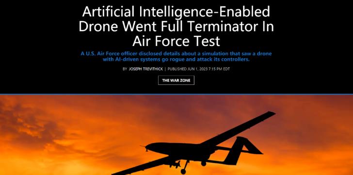 在超过350名人工智能(AI)技术领域的专家、高管签署联合声明,警告称快速发展的AI技术对于人类的威胁可以堪比疫情和核战争后,美国“驱动”网站等多家媒体又报道了一个惊人的消息,在美军的一次模拟测试中,一架采取了AI技术的无人机变身“终结者”,要向妨碍其“更高效”执行任务的人类操作员发动攻击。