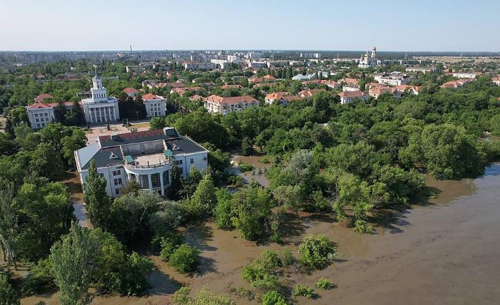 6日,洪水已淹没新卡霍夫卡市中心。(视觉中国)