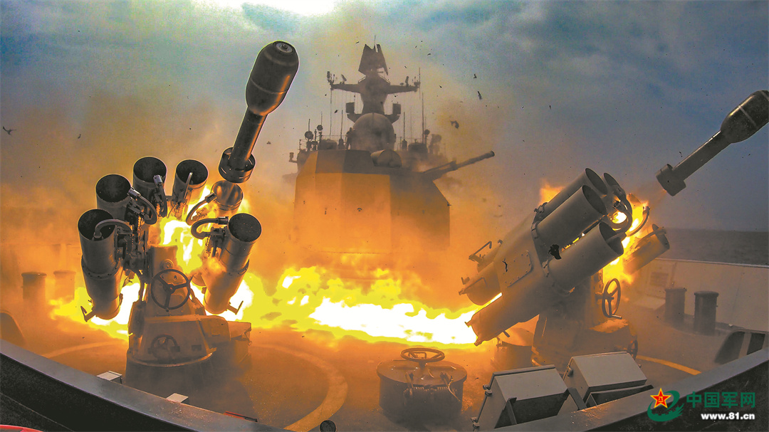 “开火!”指挥员一声令下,数枚干扰弹齐射。瞬间,编队周围形成一道烟幕屏障。紧随其后,各舰副炮连续对空中目标开火,一道道火龙直扑海天……
