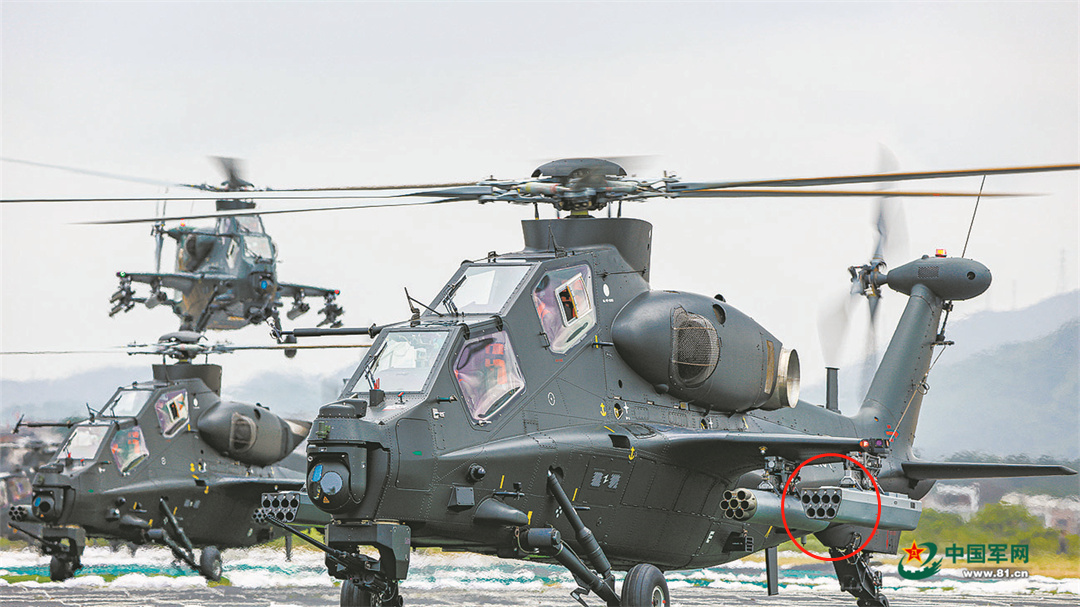 直-10武装直升机挂载了新型火箭弹发射器(红圈处)。图片来源:中国军网。