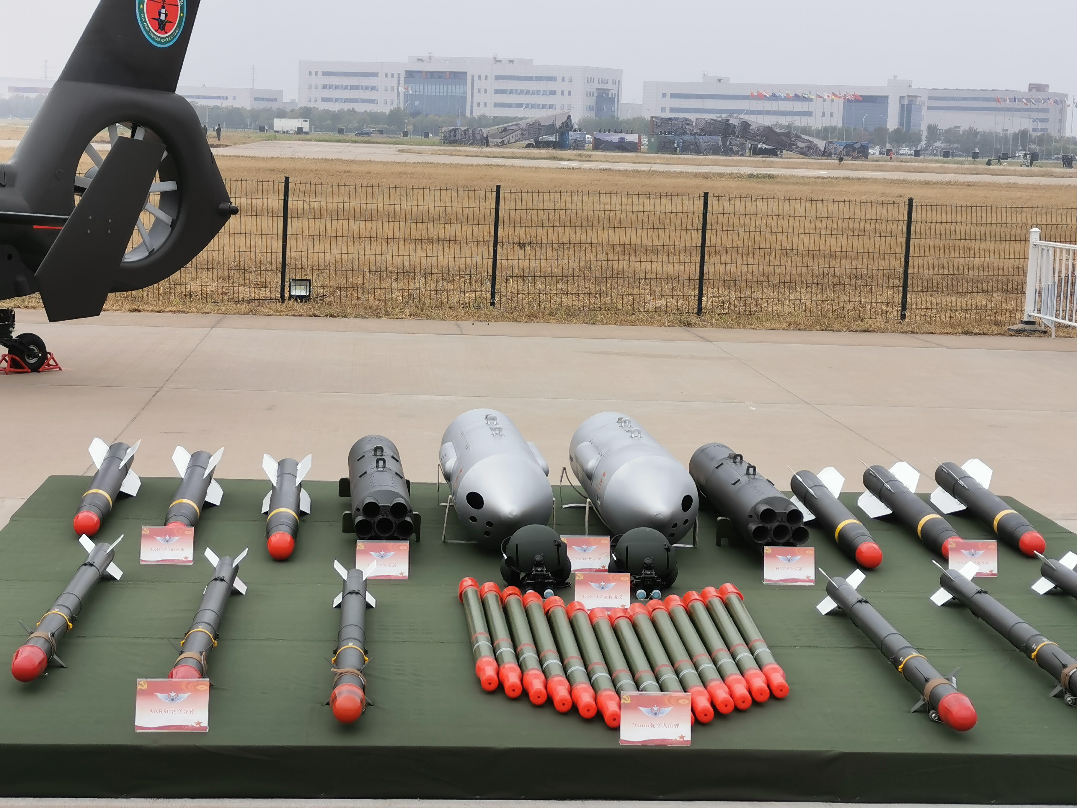 天津直博会上展示的直-19武装直升机的机载弹药,包括空地导弹、火箭弹等。